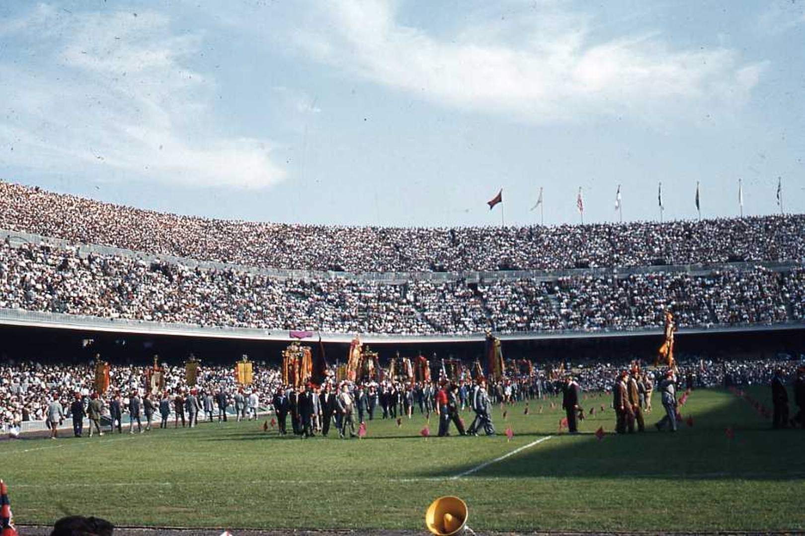On La Mercè day, under the presidency of minister Solís Ruiz as the highest authority of the regime, the new stadium filled to witness a mass held on the pitch and various performances, including a gigantic sardana involving 1,500 dancers, the Clavé Choirs, and the presence of the Orfeó Català, as well as an endless parade of penyes, Catalan teams, and other sporting groups that joined the celebration.