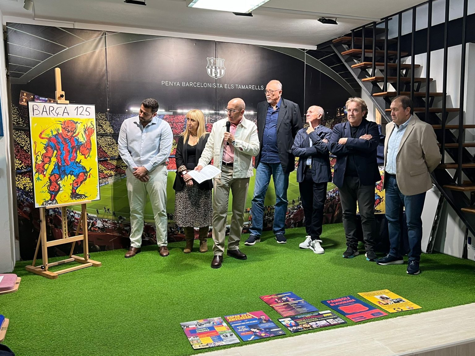 The 22nd anniversary of PB Els Tamarells began with an institutional reception at the penya headquarters in Felanitx. Attendees included the president of the Federació de Penyes de Balears, Oscar Escoda; the vice president of the Confederació Mundial de Penyes, Salva Torres; former players Juan Domingo “Lagarto” de la Cruz and Tente Sánchez; and journalist Arcadi Alibés. Representing Felanitx Town Hall were mayor Catalina Soler and sports councilor Toni Peña. All were welcomed by PB Els Tamarells president, Sebastià Oliver. During the event, a lithograph of the FC Barcelona 125th anniversary poster signed by its author, Miquel Barceló, who is a member of the Mallorcan penya, was presented.