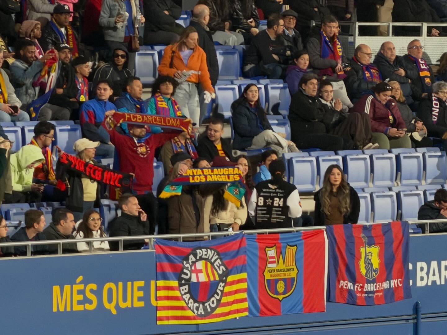 Los peñistas norteamericanos celebraron una primera fiesta de bienvenida el viernes, para después iniciar dos días cargados de actividades y también de partidos. Los integrantes del USA Penyes Barça Tour asistieron al partido del Barça femenino contra el Athletic Club en el Estadi Johan Cruyff; al Barça-Rayo del primer equipo masculino disputado en el Spotify Camp Nou; y algunos de ellos también al clásico de baloncesto entre Barça y Real Madrid en el Palau Blaugrana.