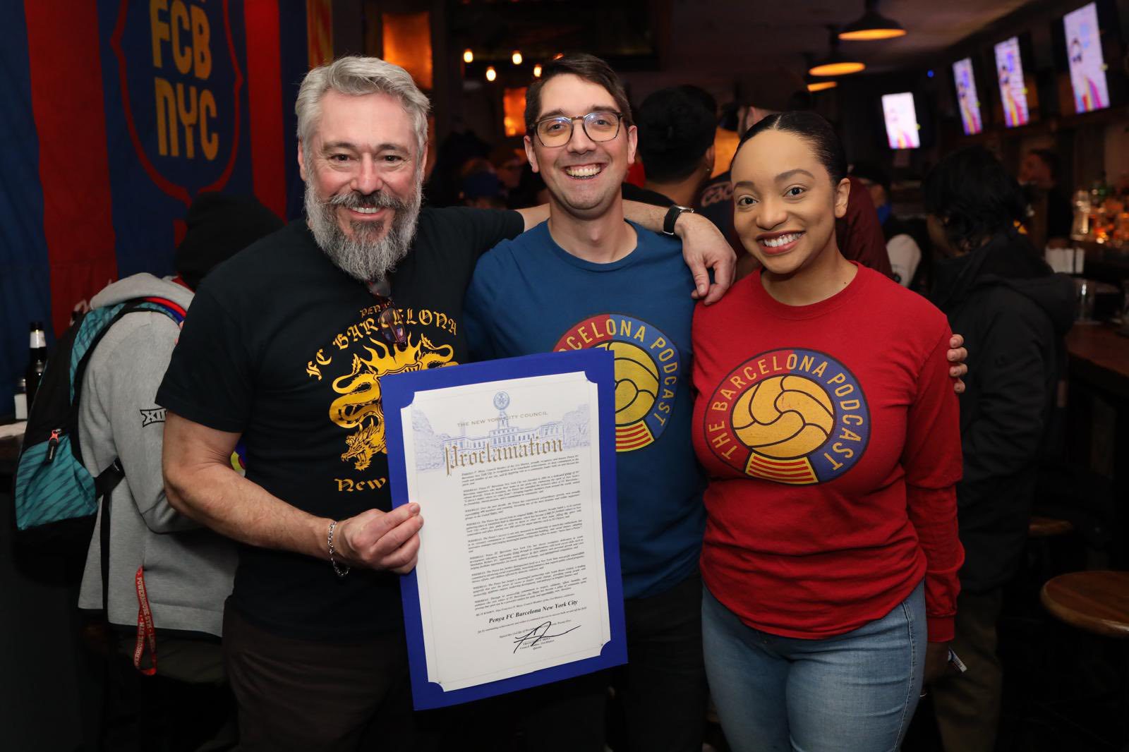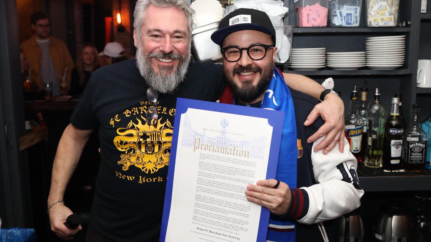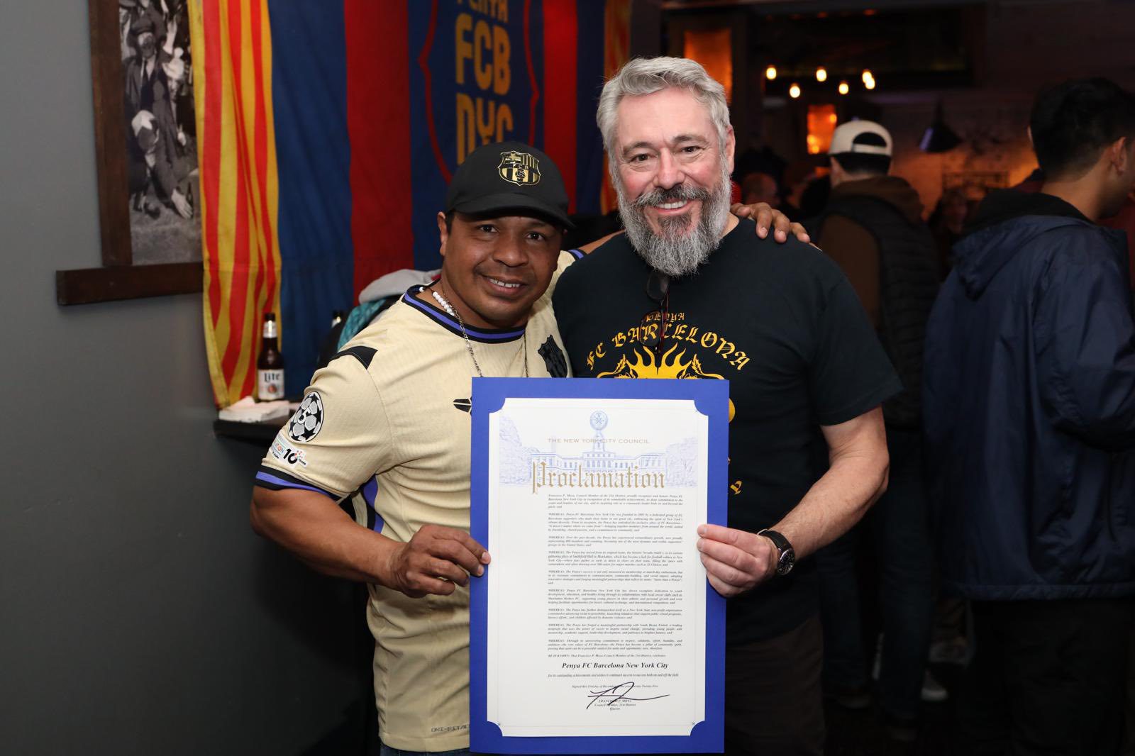 Un dels moments més emotius d’aquesta celebració del 25è aniversari de la PB Nova York va ser el lliurament de la Proclamació Oficial per part del Districte 21 de la ciutat. El president de la penya, Jordi Getman Eraso, va ser l’encarregat de rebre la distinció de mans de Francisco P. Moya, regidor d’aquest districte novaiorquès. Aquesta proclamació significa que la penya rep el reconeixement de la ciutat de Nova York, no només per recolzar el FC Barcelona, sinó per construir una comunitat, donar suport a la joventut i, en general, contribuir positivament a la vida de la ciutat.